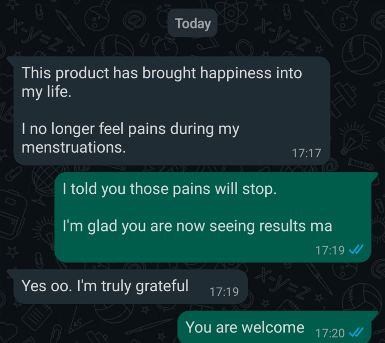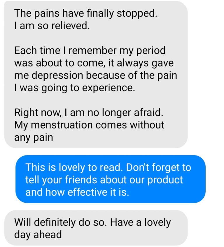 I was always crying anytime i am on my period. The pains were always too much. The pains can last for several days. Since i started using this product, i no longer feel pains during my period. As a woman, you need this product.